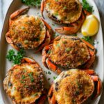 4. Bake: Place the stuffed crab shells on a baking sheet and bake in the preheated oven for 20 to 25 minutes, or until the topping is golden brown and the filling is heated through.
