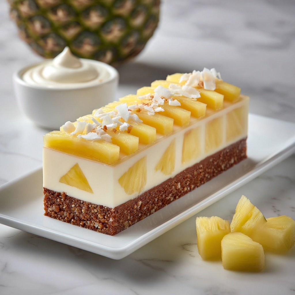 For a stunning twist, serve individual slices in clear dessert glasses layered with extra pineapple curd and whipped coconut cream. Alternatively, mini cheesecake jars make adorable gifts or treats for gatherings. Experimenting with garnishes and presentation helps make every occasion a memorable one with this versatile No Bake Vegan Pineapple Cheesecake with Coconut and Lotus Biscoff Crust Recipe.