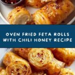 Crispy, golden oven-fried feta rolls filled with a flavorful mixture of feta cheese, fresh dill, and garlic, perfectly paired with a sweet and spicy chili honey dipping sauce.