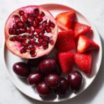 Create a luscious crescent around the pomegranate using dark cherries, red grapes, and strawberries. These fruits not only complement the pomegranate’s shade but also add a mix of textures—from the soft juiciness of strawberries to the firm snap of grapes.