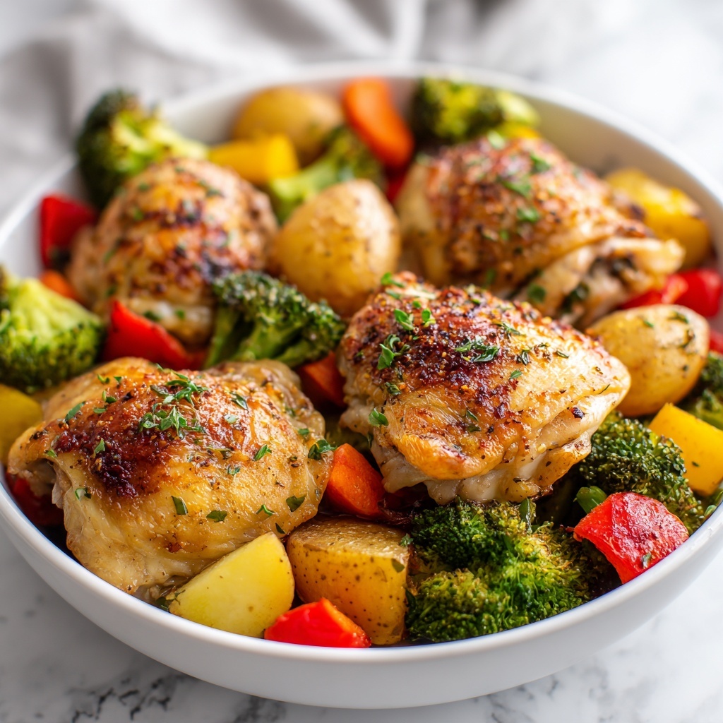 A savory and wholesome roasted garlic chicken and vegetables dish featuring bone-in chicken thighs cooked to perfection alongside tender baby potatoes, carrots, and red onion. Infused with aromatic herbs and finished with a splash of lemon juice and fresh parsley, this one-pan meal is perfect for an easy, nourishing dinner.