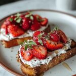 A delightful and elegant breakfast or snack featuring creamy whipped ricotta cheese topped with sweet, roasted strawberries on toasted sourdough bread. This recipe combines simple, fresh ingredients to create a deliciously light and satisfying treat perfect for any time of day.