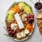 Next, fill the spaces between the cheeses with juicy red grapes, thinly sliced pear, and apple pieces. Add walnuts and dried apricots scattered in between to introduce beautiful texture variety and bursts of color. This combination offers an exciting mix of crunchy, chewy, juicy, and creamy surprises in every bite.