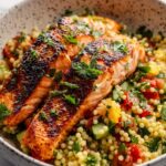 This Salmon and Couscous Bowl is a nutritious and flavorful meal perfect for a quick weeknight dinner. Tender, pan-seared salmon fillets seasoned with smoked paprika and garlic powder are served over fluffy couscous, accompanied by fresh cucumber, cherry tomatoes, red onion, and parsley. A tangy lemon-Dijon dressing ties all the flavors together for a wholesome, balanced dish.