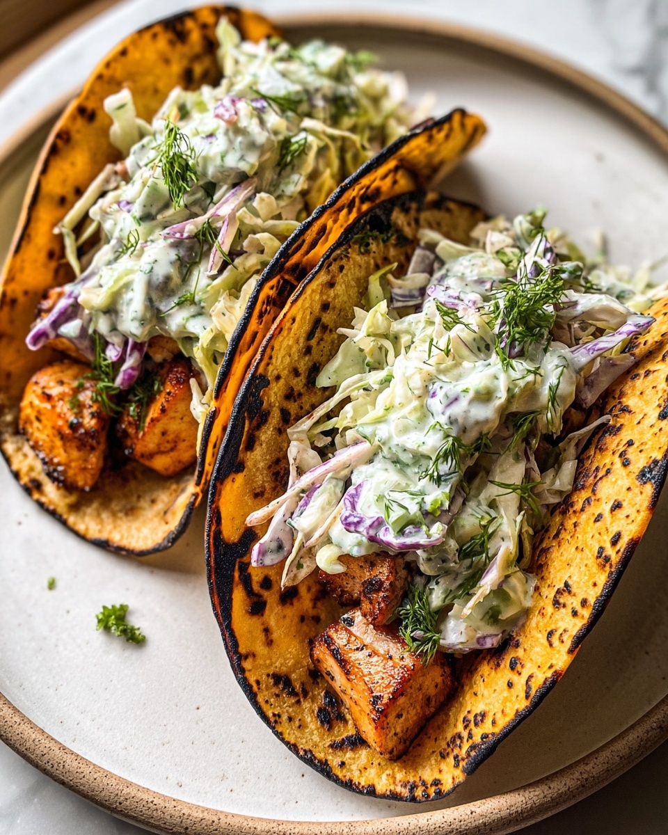 - Make the Herby Ranch Slaw: In a mixing bowl, whisk together the ranch dressing and freshly squeezed lemon juice. Add the shredded cabbage along with the chopped parsley and dill. Toss everything until the slaw is evenly coated with the dressing and herbs.