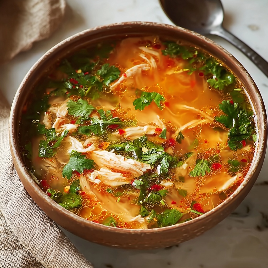 Fresh lime juice and chopped cilantro are the classic toppings that brighten the spicy chicken soup, but feel free to add thinly sliced scallions or a dash of chili flakes for extra heat and crunch. These garnishes add not only freshness but also texture, making each bite exciting and layered.