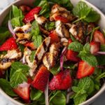 A refreshing and vibrant Strawberry Chicken Salad featuring grilled chicken breasts, mixed greens, fresh strawberries, crumbled goat cheese, and crunchy pecans, all tossed in a sweet and tangy balsamic glaze dressing. Perfect for a light lunch or a summer dinner, this salad combines healthy proteins and fresh fruits for a flavorful and colorful meal.