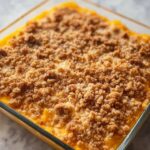 - Add Topping: Sprinkle the pecan streusel evenly over the sweet potato layer in the baking dish. If desired, add a sprinkle of mini marshmallows on top of the streusel for extra sweetness and texture.