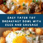 This hearty Tater Tot Breakfast Bowl combines crispy baked tater tots with fluffy scrambled eggs, savory breakfast sausage or bacon, sautéed vegetables, and melted cheddar cheese for a satisfying and flavorful morning meal.