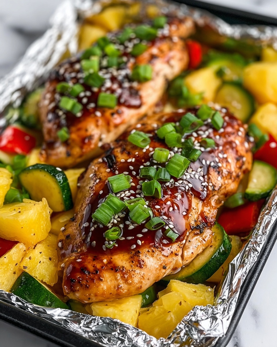 Delicious and easy Teriyaki Chicken and Pineapple Foil Packets featuring tender chicken breasts baked with fresh pineapple chunks, colorful vegetables, and savory teriyaki sauce. This one-pan meal is perfect for a quick, flavorful dinner that’s healthy and fuss-free.