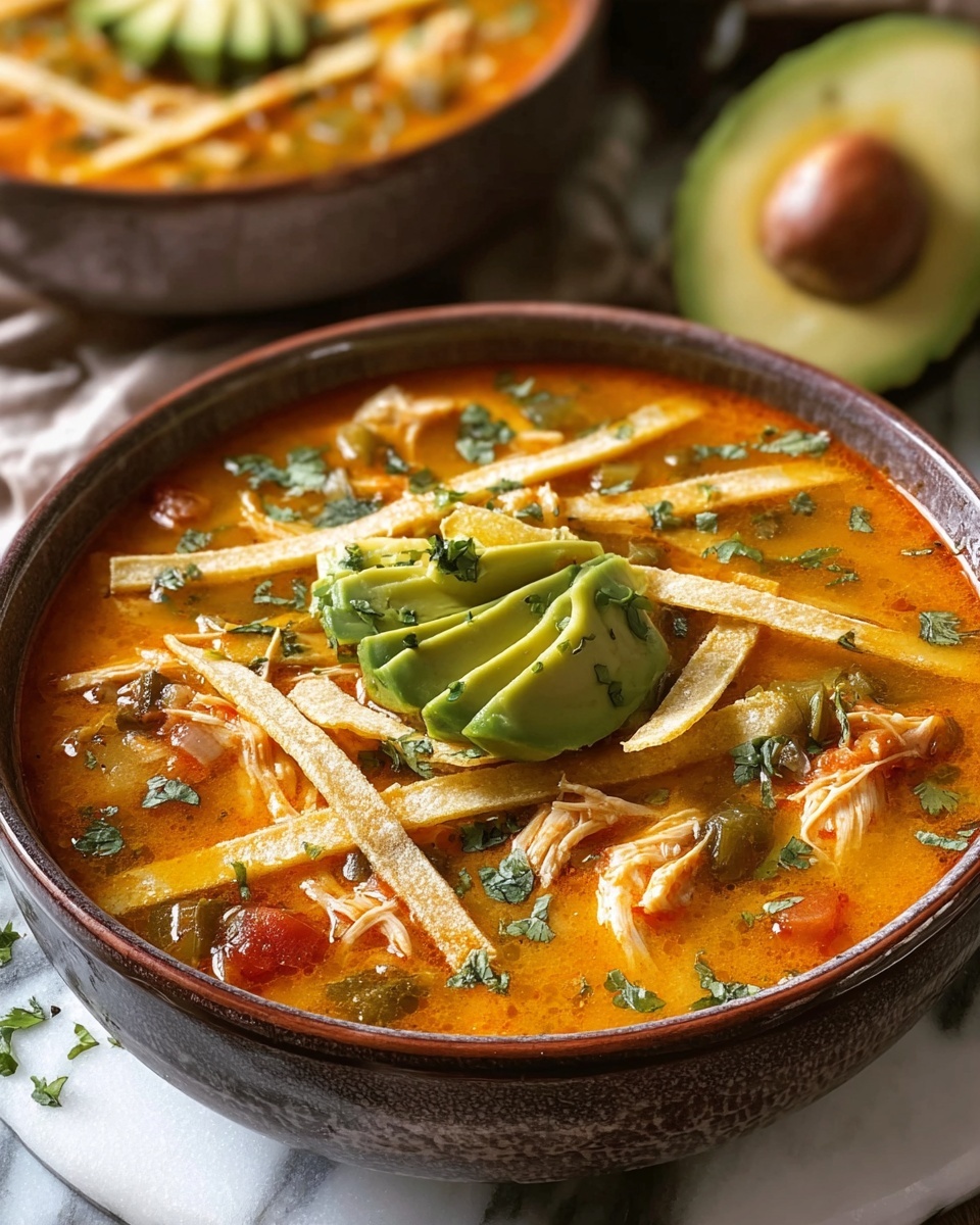 This flavorful Poblano Chicken Tortilla Soup is made from scratch using fresh ingredients like poblano peppers, tomatillos, and tender chicken breasts. The soup features a perfect blend of smoky, tangy, and mildly spicy flavors, simmered to perfection with aromatic spices and finished with crispy homemade tortilla strips. A comforting and hearty meal, garnished with fresh lime juice, avocado, cilantro, and queso fresco.