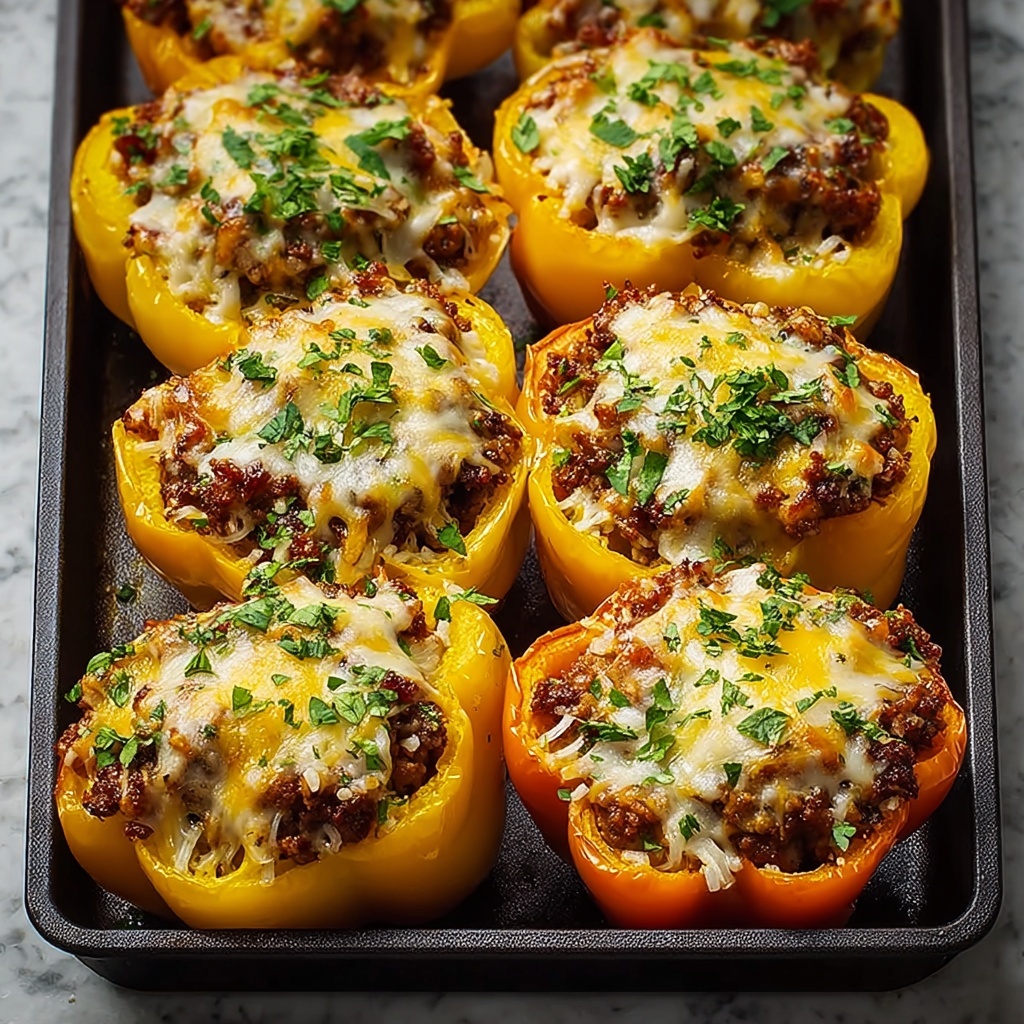 Carefully fill each hollowed bell pepper with the meat and rice mixture, packing it in firmly but gently. Arrange the stuffed peppers upright in your baking dish so they stay nicely shaped while cooking. Don’t forget to reserve a bit of shredded cheddar cheese to sprinkle on top later!