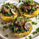 This recipe features ultimate stuffed baked potatoes loaded with a savory mixture of sautéed cremini mushrooms, garlic, and baby spinach, enhanced with almond butter, balsamic vinegar, and lemon juice. Perfectly baked russet potatoes are the base, making it a hearty, vegan, and flavorful meal that’s easy to prepare and satisfying.