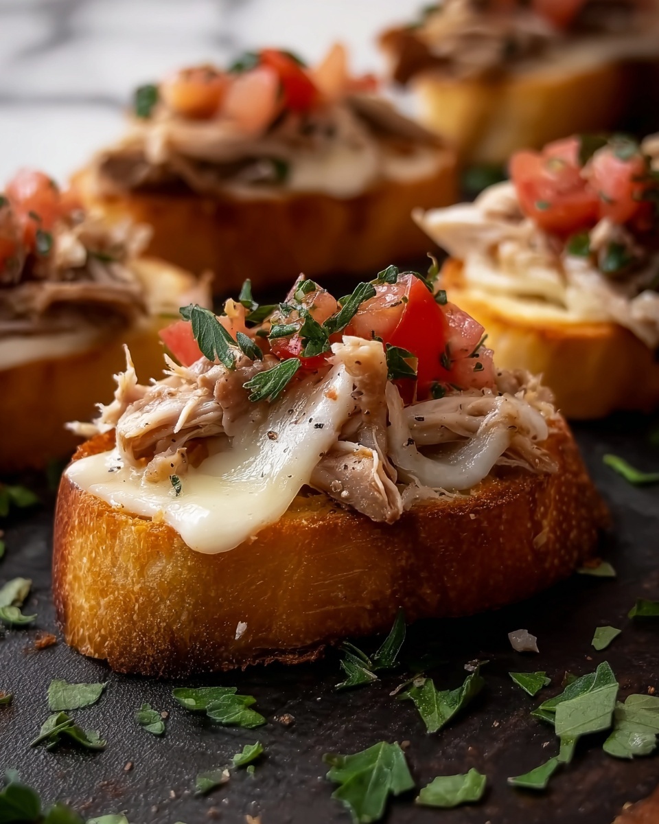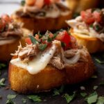 This Tuna Melt Bruschetta is a quick and delicious appetizer featuring toasted baguette slices topped with a creamy tuna mixture and melted mozzarella cheese. Perfect for a light meal or entertaining guests, this recipe combines savory tuna, melted cheese, and crispy bread for a flavorful bite.
