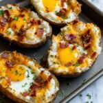 - Add Eggs and Bake Again: Crack one egg into the well of each stuffed potato half. Place the filled potatoes on a baking sheet and bake at 375°F (190°C) for 15–20 minutes, or until the egg whites are set and yolks are cooked to your preference.
