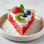 Now comes the fun part! Decorate each slice generously with strawberries, blueberries, and kiwi. Scatter fresh mint leaves over the top for a refreshing herbal note, then finish with a light sprinkle of shredded coconut to add texture and a hint of tropical flair.