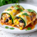 These Zucchini Enchilada Roll Ups are a healthy, delicious twist on traditional enchiladas, featuring thinly sliced zucchini wrapped around a savory filling of shredded chicken, black beans, and corn, all baked in flavorful enchilada sauce and topped with melted cheddar cheese. Perfect as a low-carb, protein-packed meal that’s bursting with taste and easy to prepare.